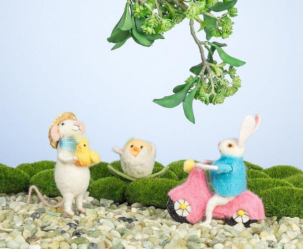 This bunny is going places. Clad in a blue outfit and riding a tiny felt scooter, it adds movement and storytelling to your seasonal display.