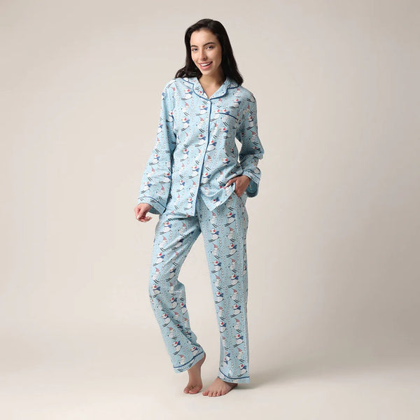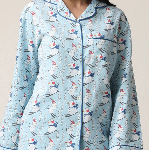 Jolly snowmen skiing through a forest of quirky white trees, all set on a frosty blue background. With cheery hats and polka-dot scarves flying, it's a snowy adventure full of winter fun!