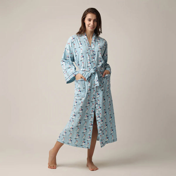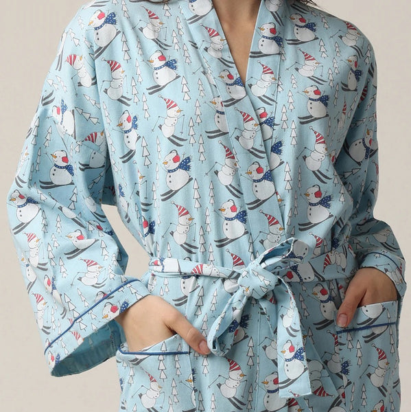 Jolly snowmen skiing through a forest of quirky white trees, all set on a frosty blue background. With cheery hats and polka-dot scarves flying, it's a snowy adventure full of winter fun!